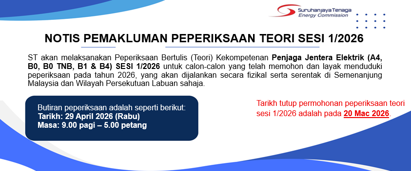 ST hanya akan melaksanakan SATU (1) SESI Peperiksaan Bertulis (Teori) Kekompetenan Penjaga Jentera Elektrik (A4, B0, B0 TNB, B1 & B4) untuk calon-calon yang telah memohon dan layak menduduki peperiksaan pada tahun 2025, yang akan dijalankan secara fizikal serta serentak di Semenanjung Malaysia dan Wilayah Persekutuan Labuan sahaja. Untuk maklumat lanjut sila klik di SINI.