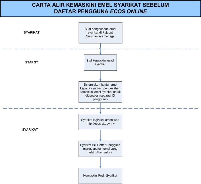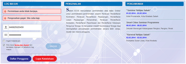 Pengguna perlu mendaftar sebagai pengguna Sistem ECOS terlebih dahulu. Jika telah mendaftar, sila ke laman sesawang (http://ecos.st.gov.my) untuk akses ke Sistem ECOS. Pengguna boleh akses ke Sistem ECOS ini menggunakan antaramuka Mozilla Firefox, Google Chrome, Internet Explorer 8.0 (ke atas).