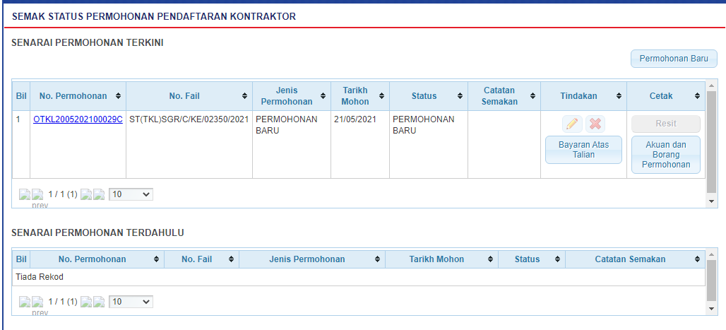 1. Senarai permohonan pemohon akan dipaparkan. Senarai dipaparkan termasuk:
