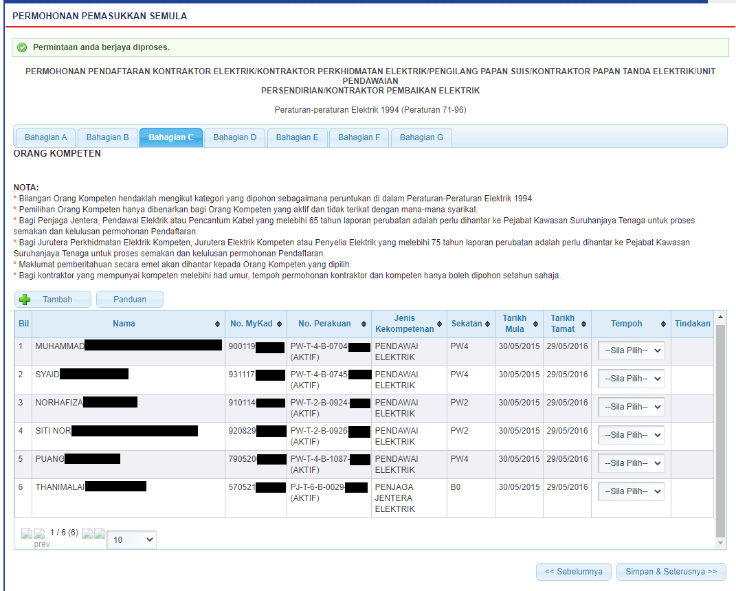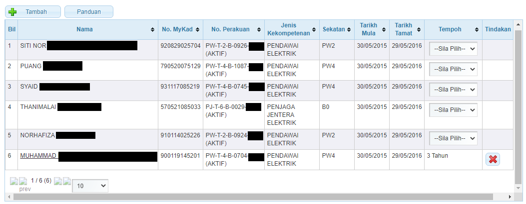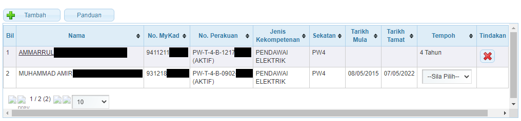 3. Pilih tempoh pembaharuan orang kompeten pada lajur Tempoh.