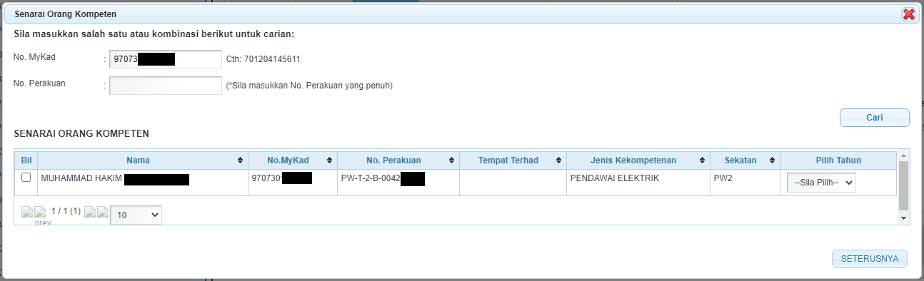 , skrin carian orang kompeten akan ditutup dan sistem akan paparkan maklumat orang kompeten yang dipilih pada jadual Orang Kompeten.