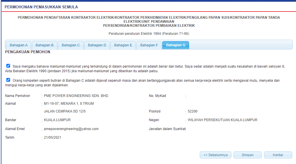 Skrin 14: Antaramuka Pengakuan Pemohon - Tab BAHAGIAN G