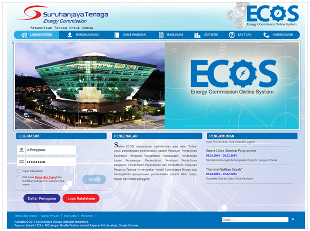 Pengguna perlu mendaftar sebagai pengguna Sistem ECOS terlebih dahulu. Jika telah mendaftar, sila ke laman sesawang (http://ecos.st.gov.my) untuk akses ke Sistem ECOS. Pengguna boleh akses ke Sistem ECOS ini menggunakan antaramuka Mozilla Firefox, Google Chrome, Internet Explorer 8.0 (ke atas).